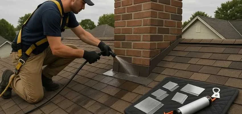 We examine crown slope, cap fit, mortar joints, brick or stone surfaces, and flashing transitions at the roofline. In McKeller Home Place, Forney this area is often the origin of leaks.